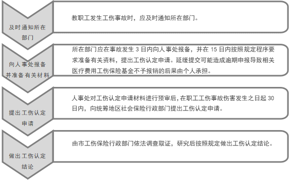 1.职工发生事故伤害或按照职业病防治法规定被诊断、鉴定为职业病,所在单位应自事故伤害发生之日或被诊断、鉴定为职业病之日起30日内,向统筹地区社会保险行政部门提出工伤认定申请。用人单位未按前款规定提出工伤认定申请的,工伤职工或者其近亲属、工会组织在1年内可以直接提出工伤认定申请。因未及时向学校报告,而错过工伤认定申请时限的,其工伤认定前发生的费用,由个人承担。