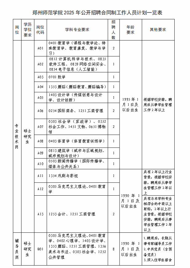 附件:郑州师范学院2025年公开招聘合同制工作人员计划一览表